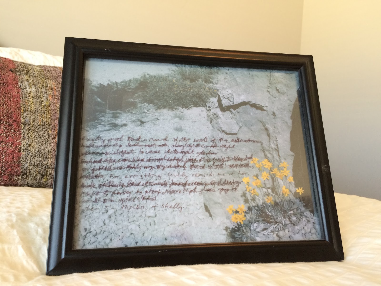 In fact, the first gift he ever gave me (for my birthday when we were dating) was a poem that he wrote for me. He stayed up until 3:00 am writing it. He wrote the poem on three different layers of transparency, so when they are all on top of each other you can’t read it, but when you take each piece out at a time, you can. Behind the transparency, is a picture of rocks and flowers that he had taken on one of his hikes.