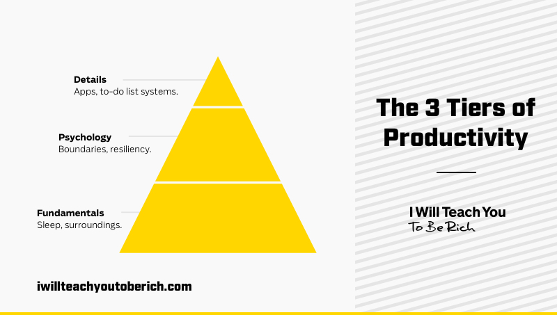 He makes a pyramid stating at the heart of our productivity issues is our physical and mental well-being. Once those are in place, THEN we can start working out productivity details, but often we get this entirely backwards and flip the pyramid on its head.